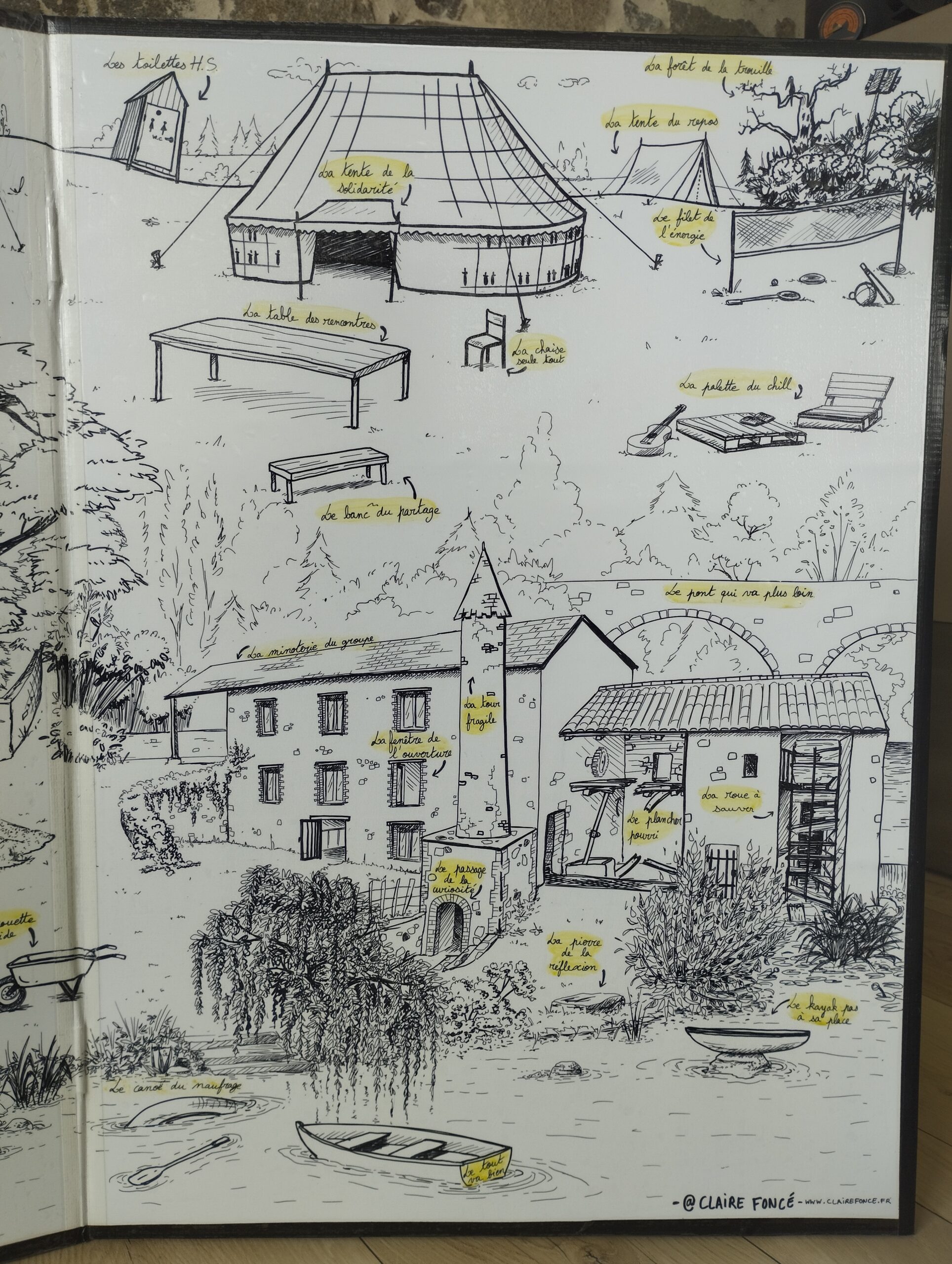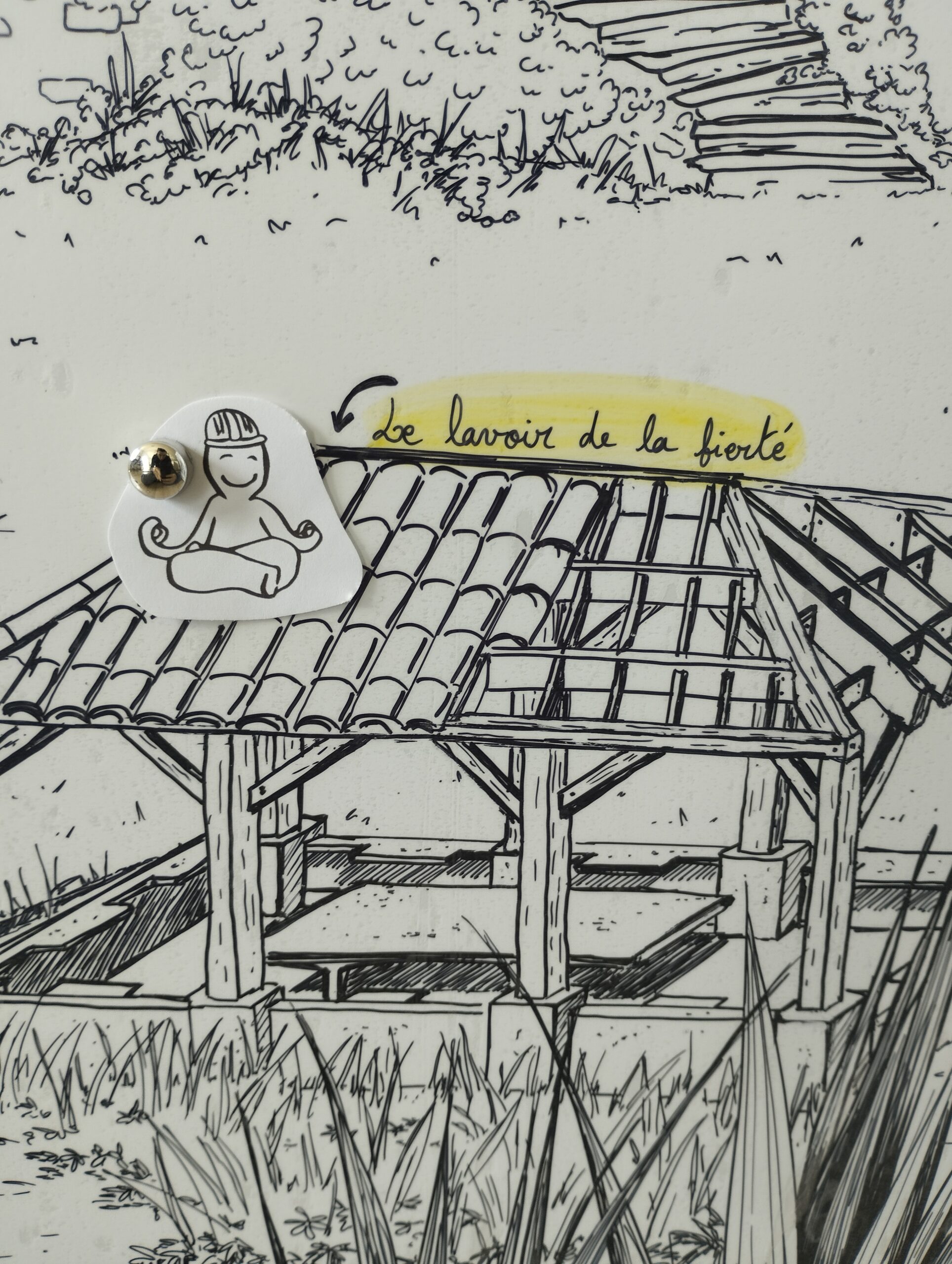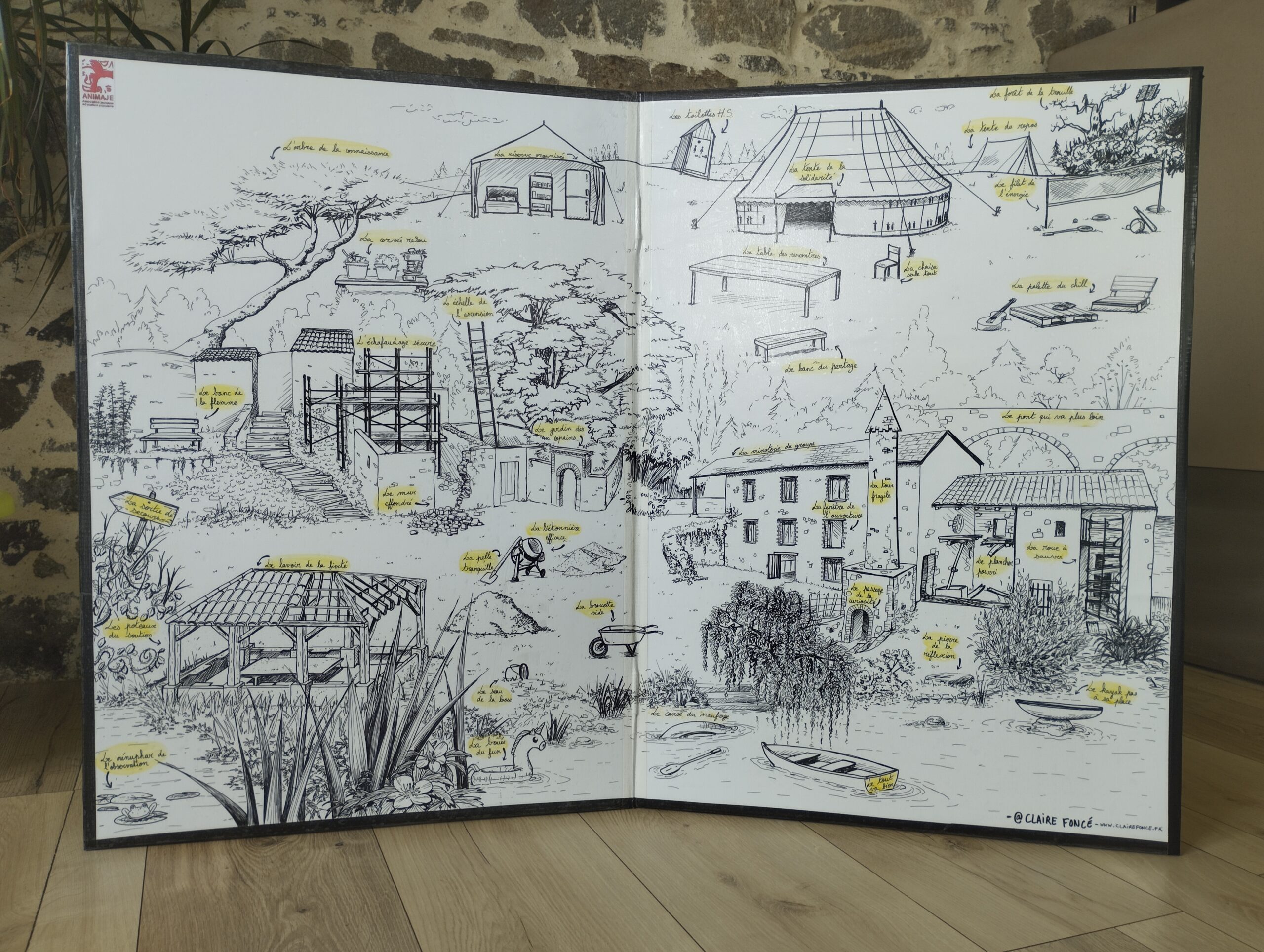 La demande était de réaliser un outil représentant les chantier solidaires menés par l’association et devant servir lors de ces chantiers aux jeunes bénévoles, afin de parler de leur ressenti, leur évolution dans ce projet solidaire. Cette fresque devait également avoir les contraintes techniques d’un transport facile, léger, et surtout réutilisable. Point important de cette illustration, représenter 3 lieux différents et éloignés du projet dans un seul dessin.